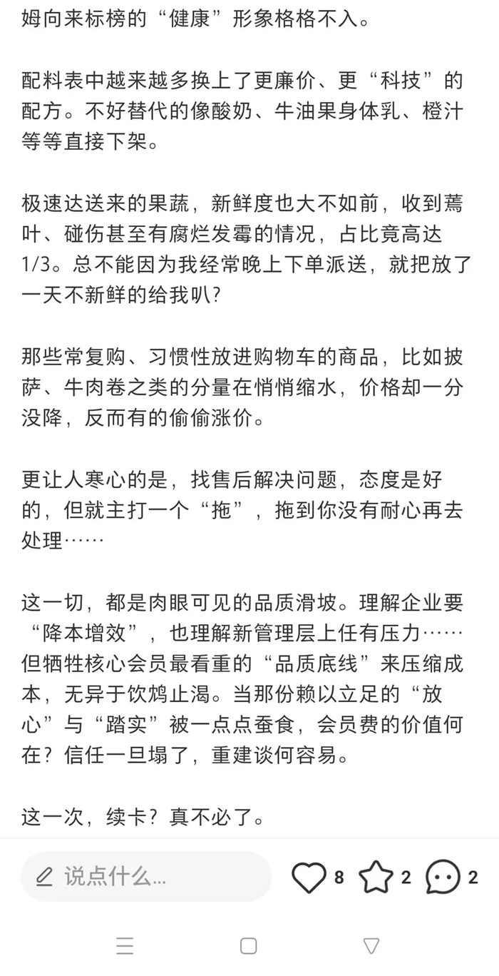 如果说价格波动只是让会员们感到不满,那品质问题的出现,则像是在信任的堤坝上打开了一道缺口。